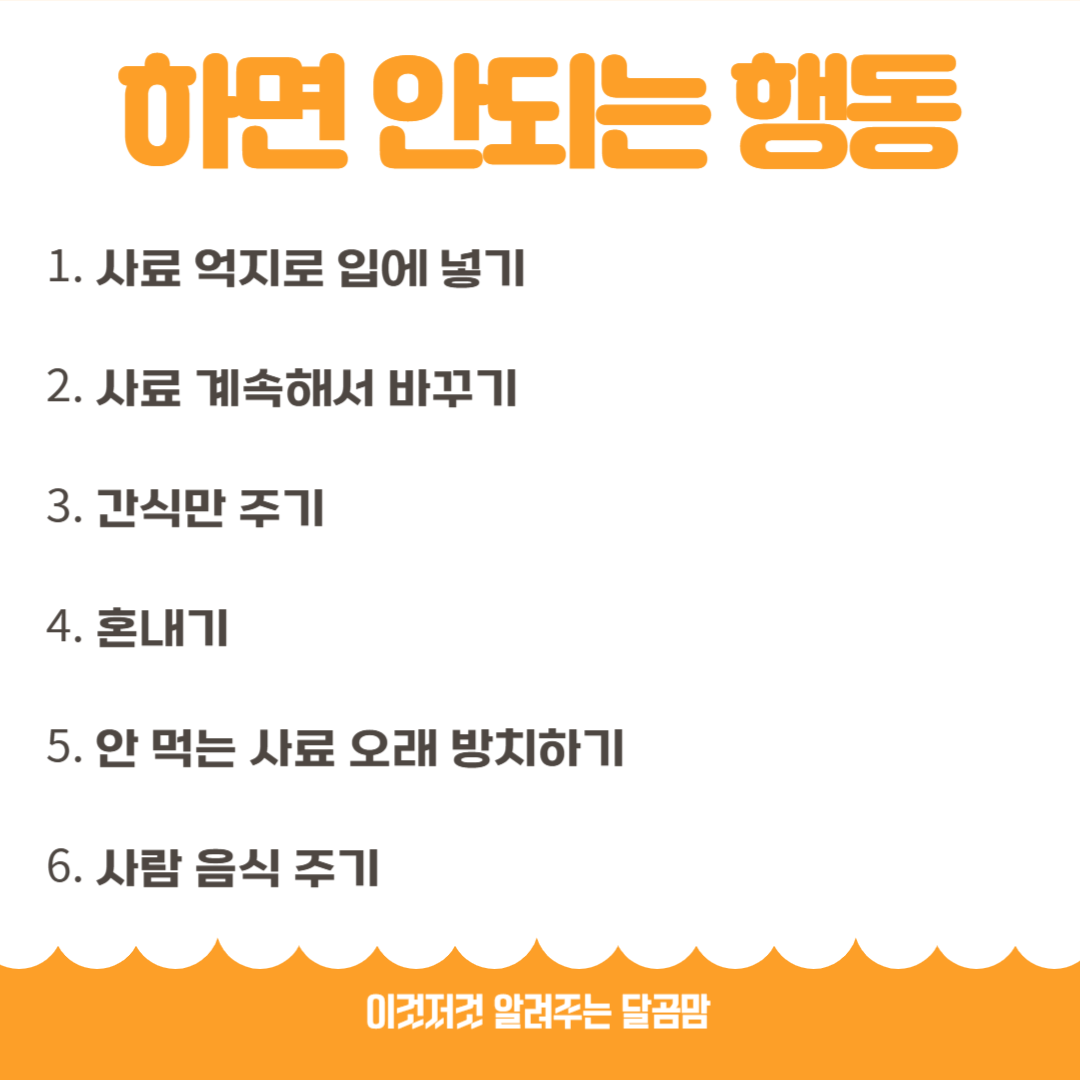 강아지가 밥을 안 먹을 때 보호자가 주의해야 할 행동이 몇 가지 있습니다. 가장 먼저, 억지로 입에 밥을 넣는 것입니다. 억지로 밥을 먹이는 것은 강아지에게 스트레스를 줄 수 있고, 식사에 대한 부정적인 인식을 심어줄 수 있습니다. 또한, 강아지가 밥을 안 먹는다고 해서 사료를 계속 바꾸거나 간식 또는 사람 음식을 주는 것도 위험합니다. 이는 편식 습관을 만들고, 사료에 대한 흥미를 떨어뜨릴 수 있거든요. 밥을 먹지 않는다고 혼내는 것도 안됩니다. 강아지가 혼난다고 이유 없이 밥을 먹는 것이 아니기 때문에, 오히려 불안만 커질 수 있습니다. 그리고 안 먹는 사료를 오래 방치하면 신선도가 떨어지게 되고 강아지의 식욕은 더욱 없어질 수 있습니다. 밥을 안 먹는다고 무조건적으로 걱정하기보다는 '왜 그런지' 차근차근 원인을 살펴보며 강아지의 컨디션을 함께 관찰해 보세요.