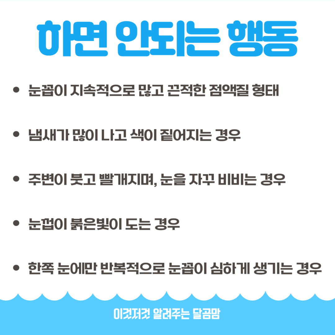마지막으로, 한쪽 눈에만 유독 눈꼽이 많이 생기고 그 증상이 반복되는 경우에도 문제가 될 수 있습니다. 이런 경우에는 눈에 이물질이 들어갔거나 눈물샘 이상, 결막염 등이 원인일 수 있습니다.