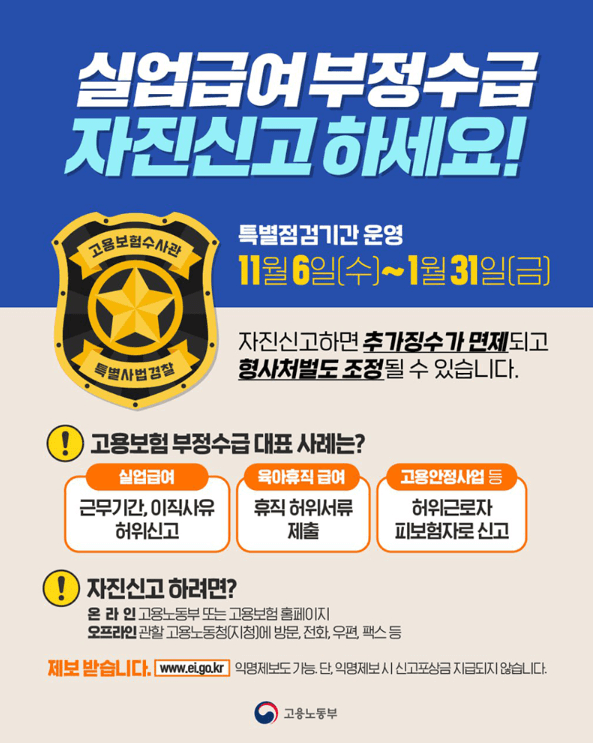 2024년 11월 6일(수) ~ 2025년 1월 31일(금)까지 실업급여 부정수급 특별점검 기간이 운영됩니다. 이 기간 동안 고용노동부는 집중적으로 부정수급 사례를 점검하고, 자진신고를 장려하고 있습니다. 만약 부정수급 사실을 스스로 신고할 경우, 추가 징수가 면제되며 형사처벌도 조정될 수 있어, 문제 해결을 위한 기회를 제공합니다. 자진신고를 통해 더 큰 불이익을 피하는 현명한 선택을 권장합니다.