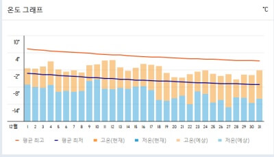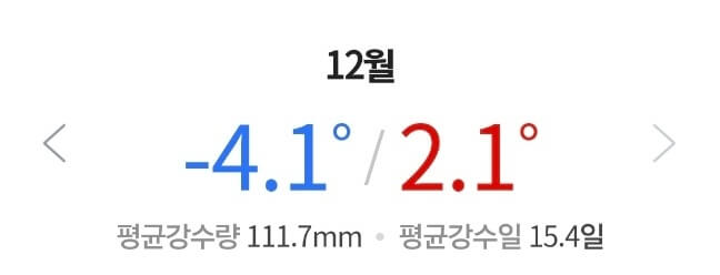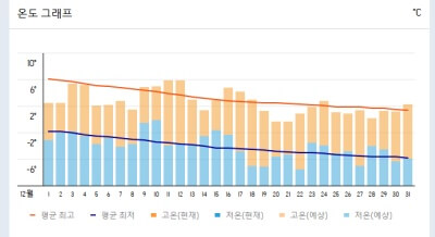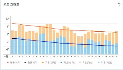 평균 최저기온은 -4.1℃, 평균 최고기온이 2.1 ℃로 겨울철의 기온분포를 보입니다. 일교차는 평균적으로 6.2 ℃로 벌어져 전형적인 겨울철 추운 기온이라고 생각하시면 됩니다.