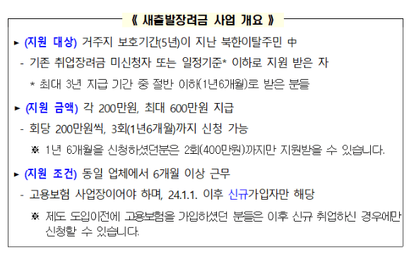 지원 대상은 거주지 보호기간 5년이 지난 탈북민 중 기존 취업 장려금을 신청하지 않았거나 3년간의 지원기간 중 절반 이하를 받은 분들입니다. 동일 직장에서 6개월 이상 근무하는 조건이 있어, 지속적인 근로를 통한 자립을 장려합니다.