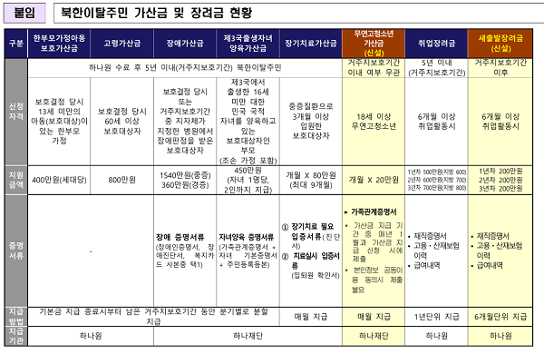 지금까지 탈북민 지원금인 무연고 청소년 가산금과 새출발 장려금에 대해 알아봤습니다. 이 두 제도는 탈북민의 자립과 경제적 안정에 큰 도움을 주는 제도입니다. 필요 서류와 절차를 꼼꼼히 확인하시고 적극 활용해 보시실 바랍니다.