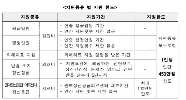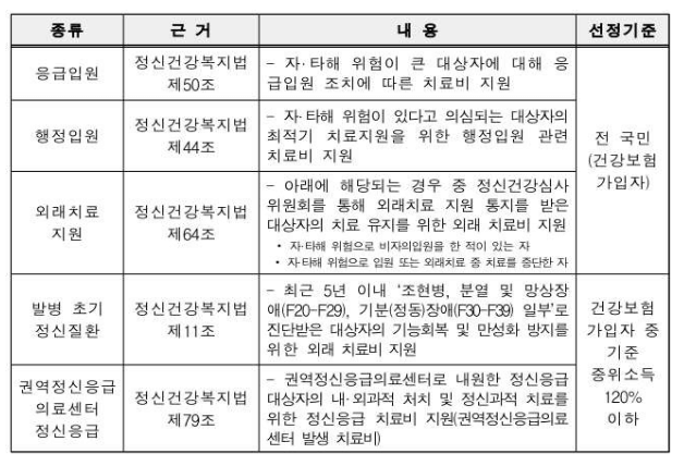 단, 발병 초기 환자와 권역정신응급의료센터 치료비 지원은 가구 소득이 중위소득 120% 이하인 경우에만 가능합니다.