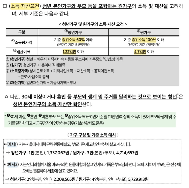 청년 가구 총 재산가액이 1.22억 원 이하인자와 원가구 총 재산가액이 4억 7천만 원 이하인 자만 신청할 수 있습니다.