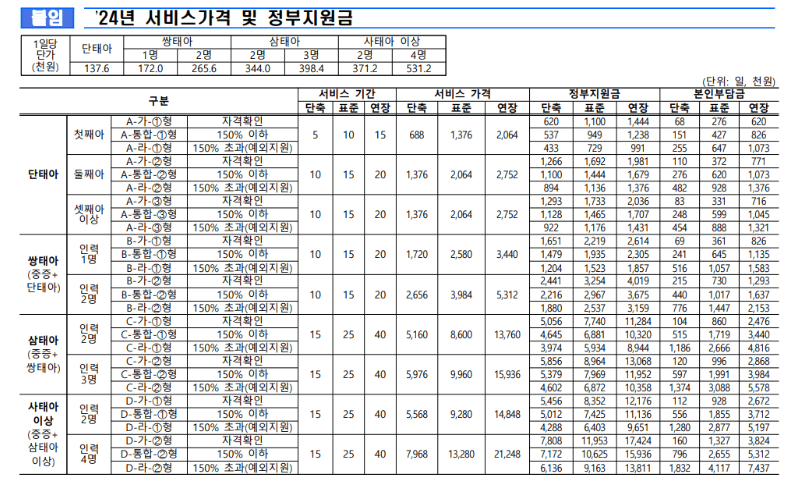 예를 들어 단태아, 첫째아, 10일 기준으로 총 서비스 가격은 1,376,000원이며, 이 중 949,000원을 정부가 지원하고 본인 부담금은 427,000원입니다.