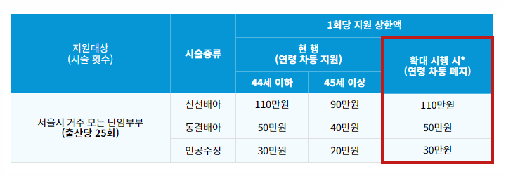 지원횟수를 기존 부부당 25회에서 출산당 25회로 확대합니다. (인공수정 5회, 체외수정 20회) 기존에는 출산에 성공해도 지원 기회를 다 소진하면 다음 임심에는 기회가 없었습니다. 하지만 이 기준을 출산당으로 확대하여 지금까지의 출산에 상관 없이 다음 출산 시도시 다시 25회의 난임시술 지원을 받을 수 있습니다.