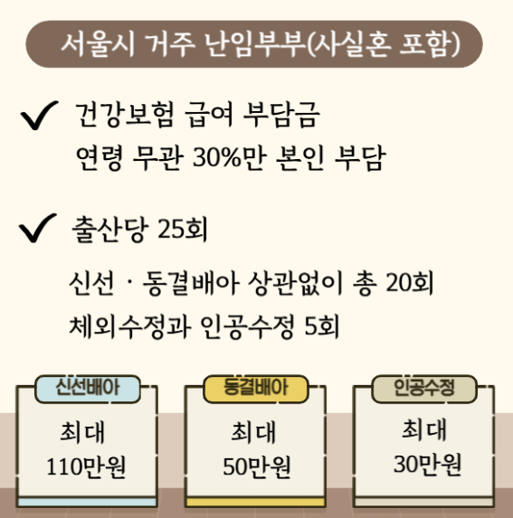 서울시에 거주하는 모든 난임 부부가 받을 수 있습니다. 사실혼 관계도 포함됩니다.