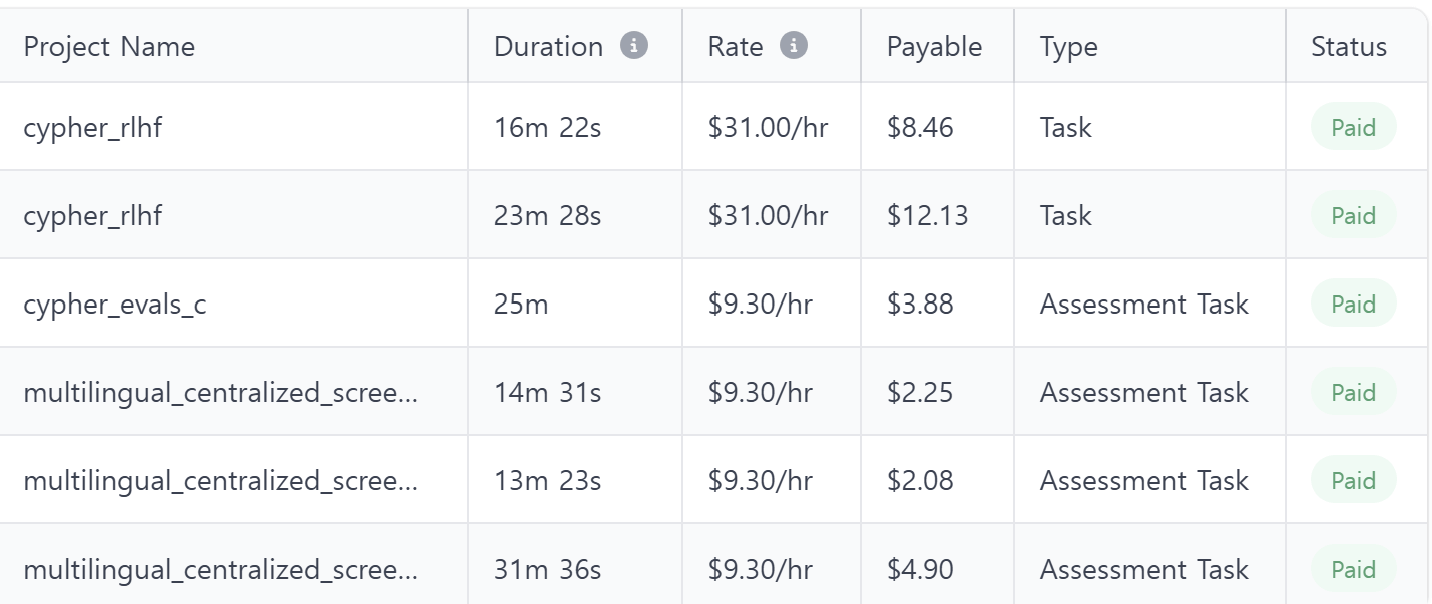 작업은 비정기적으로 주어지며, 일이 분배되는 기준은 알 수 없습니다. 본격적인 프로젝트 전에 트레이닝 과제가 다수 주어집니다. 트레이닝에서 일정 기준 점수를 넘겨야만 본 작업을 진행할 수 있는데, 난이도가 꽤 높아서 쉽지 않았습니다. 프로젝트 내용은 AI답변을 평가하고 평가 이유를 영어로 작성하거나, 프롬프트를 작성하고 이를 올바르게 평가하는 일을 합니다.