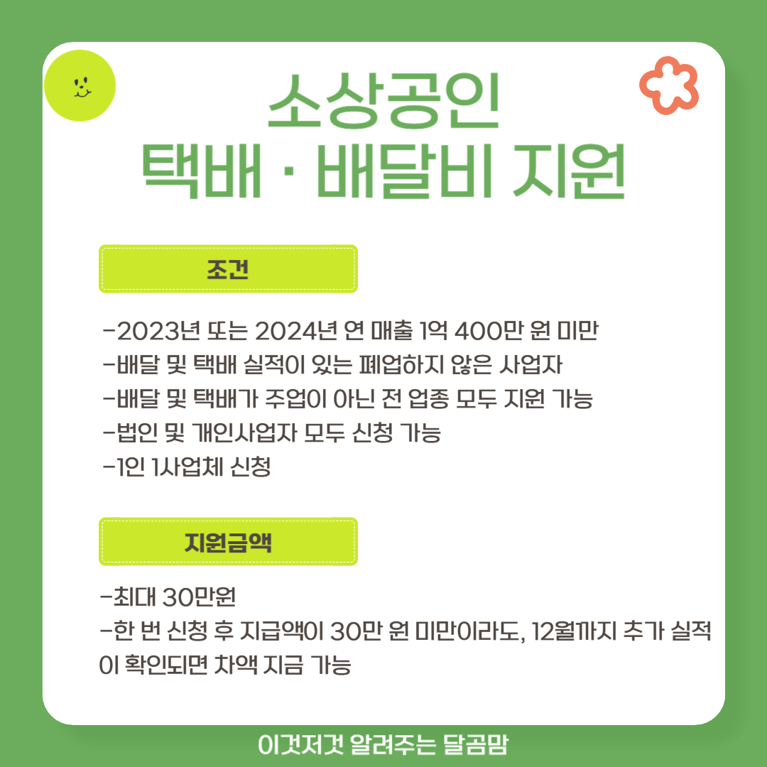 지원 대상으로는 2023년 또는 2024년 연 매출이 1억 400만 원 미만인 소상공인으로 배달 및 택배 실적이 있으며 신청일 기준으로 폐업을 하지 않은 사업자입니다. 배달 및 택배가 주업이 아니라도 전 업종이 지원이 가능합니다. 단, 소상공인 정책자금 제외 업종은 제외됩니다. 법인 및 개인사업자 모두 신청이 가능하며 1인 1 사업체만 신청할 수 있습니다.