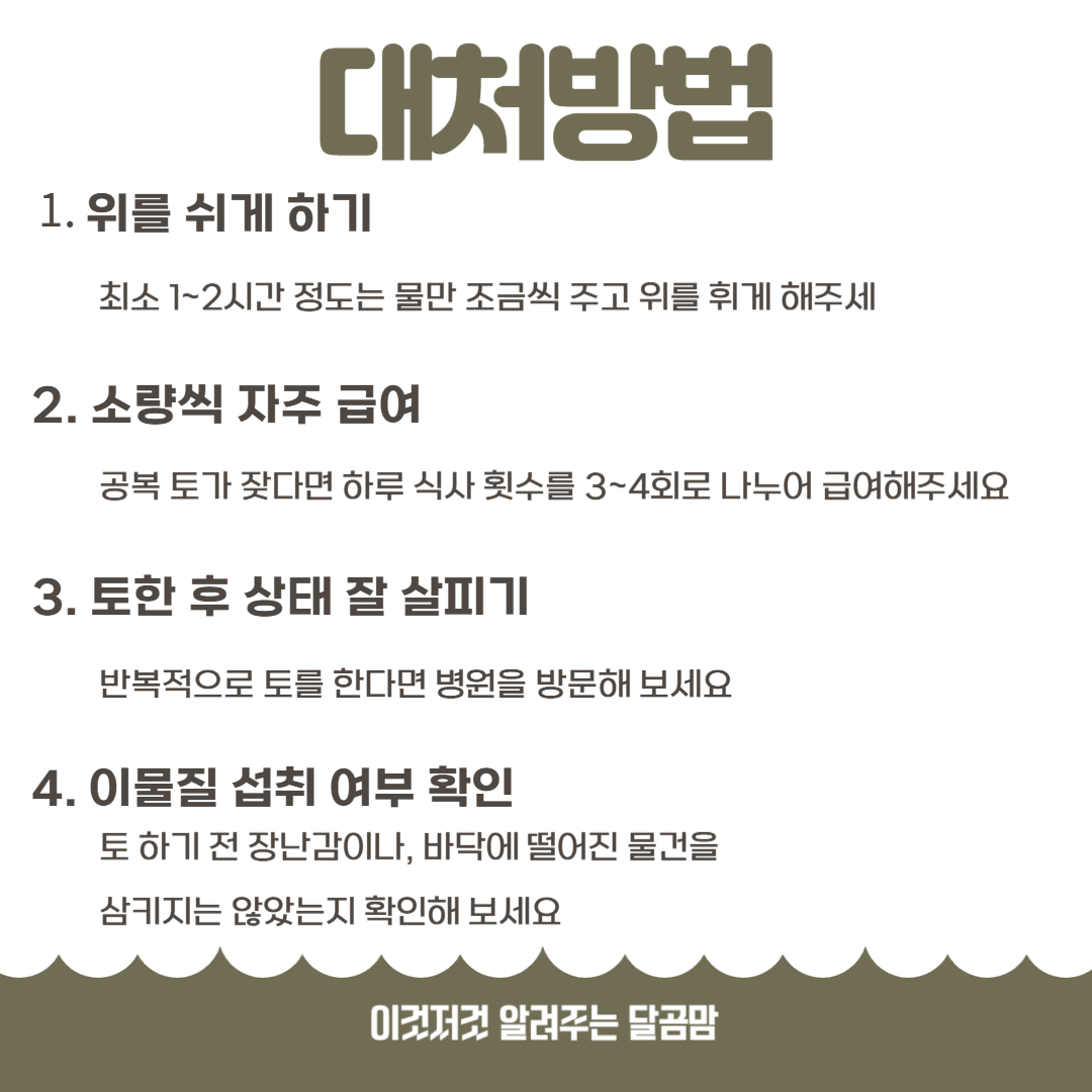 강아지가 토하는 것은 다양한 원인이 있을 수 있습니다. 가끔씩 한두 번 토하는 것은 보통 크게 걱정할 필요가 없습니다. 하지만 반복적인 구토나 이상 증상이 동반된다면 빠르게 수의사의 상담을 받아주세요. 강아지의 건강을 지키기 위해 보호자가 세심하게 관찰하고 적절한 대응을 해주는 것이 중요합니다!
